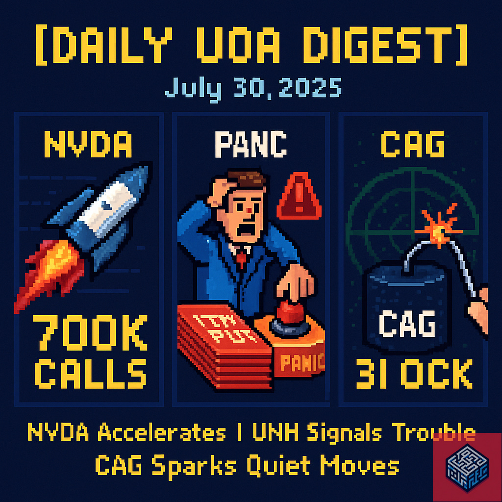 July 30, 2025 – NVDA detonates with over 700K call contracts across two expiries—pure velocity, no hesitation. UNH flashes red with deep ITM put stacking across the board. 31K contract on CAG.